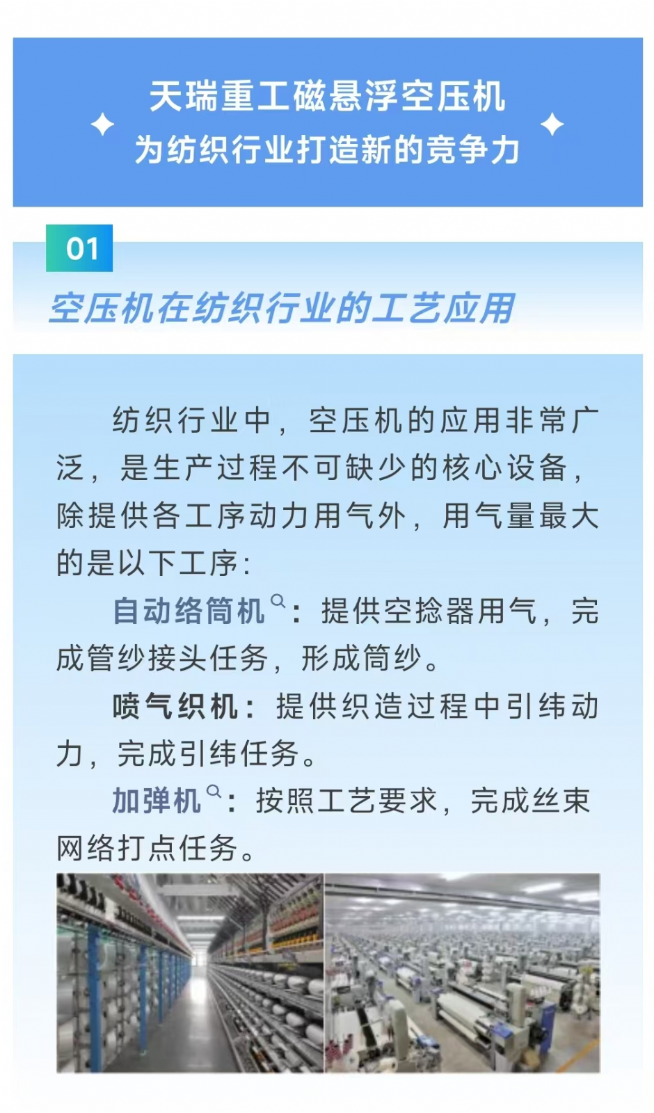 紡織行業(yè)中,空壓機(jī)的應(yīng)用非常廣泛,是生產(chǎn)過程不可缺少的核心設(shè)備,除提供各工序動力用氣外,用氣量大的是以下工序: