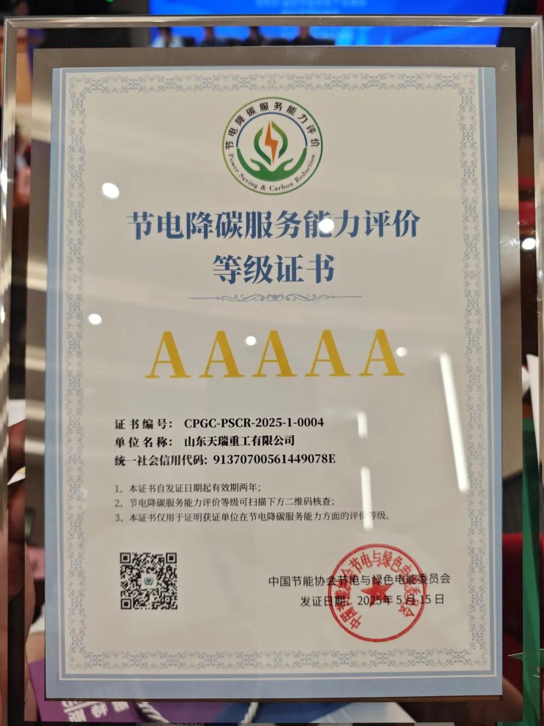 活動期間,天瑞重工榮膺“2025年第 一批節(jié)電降碳服務(wù)能力評價(jià)AAAAA級單位”稱號!該認(rèn)證由權(quán)威機(jī)構(gòu)及專家評定,從技術(shù)研發(fā)、項(xiàng)目落地、碳減排成效等多維度綜合考核,再次肯定了天瑞重工在綠色服務(wù)領(lǐng)域的突 出貢獻(xiàn)和領(lǐng) 先地位。